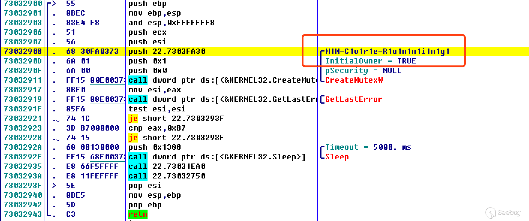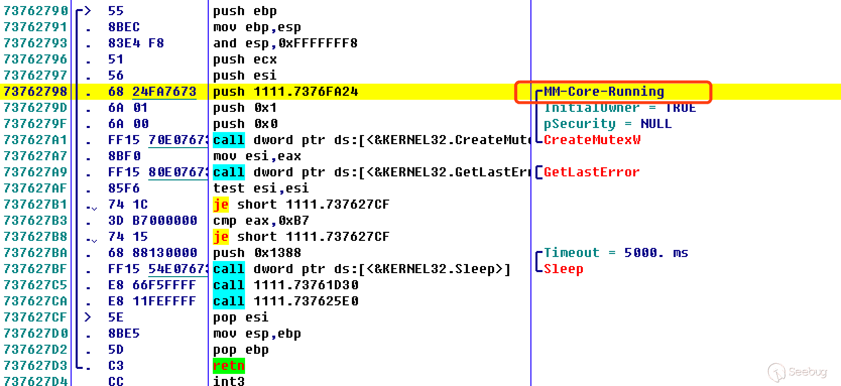 該惡意文件第一次被稱為MMcore為國外安全公司Forcepoint的一篇分析報告,但是該文章并未解釋得名的由來。經過我們的跟蹤發現,最初版本的MMcore中,其互斥量的取名為" MM-Core-Running ",因此我們猜測,Forcepoint因此而給該惡意文件取名為MMCore: