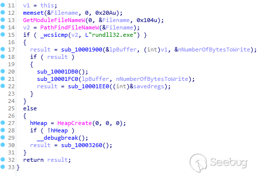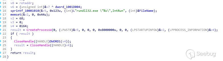 dllmain中首先判斷加載的進程是否為rundll32.exe,不是則執行木馬安裝操作: