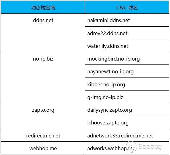 MMCore的攻擊團伙比較偏愛動態域名,使用的動態域名包括有ddns.net、zapto.org、no-ip.org、redirectme.net等,部分信息總結如下表: