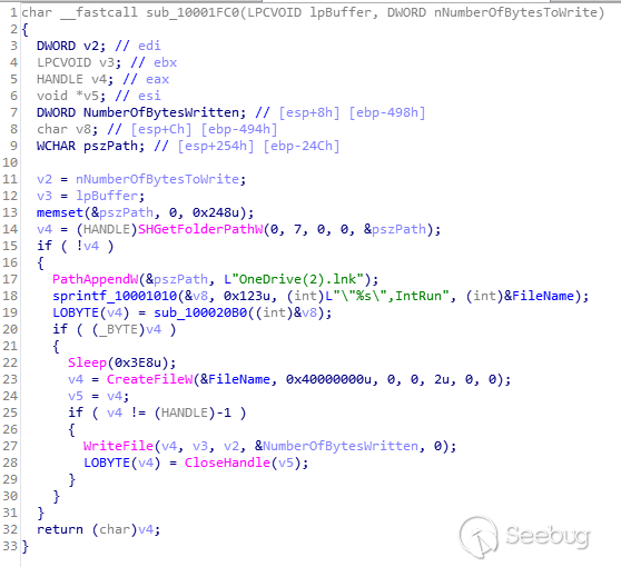 在啟動目錄下釋放OneDrive(2).lnk文件實現持久化,該lnk快捷方式指向rundll32.exe加載C:\ProgramData\DailyUpdate\opendrive64.dll并調用其IntRun函數: