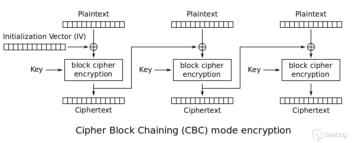 CBC全稱為Cipher-Block Chaining,算是最常見的塊加密模式了。在CBC模式中,每個明文塊都會在加密前被使用前一個明文塊的秘文進行異或;解密過程則正好相反。其中第一個明文塊會被使用IV即初始化向量進行異或。