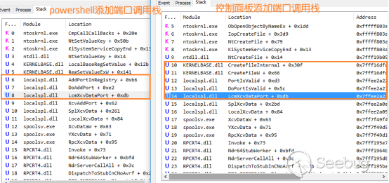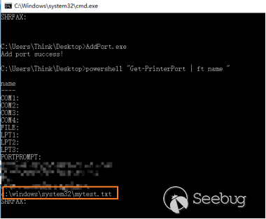 通過控制面板添加打印機在底層是調用了AddPort函數,該函數會觸發spooler程序對端口的合法性校驗。通過PowerShell命令添加打印機在底層則是直接調用XcvData函數,該函數不會觸發spooler程序對用戶添加的端口進行安全校驗。因此,測試程序AddPort.exe通過該函數在標準用戶權限下也能設置打印機端口為受保護目錄中的文件。