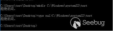 2)在test賬戶下,嘗試在系統目錄下創建文件夾或者寫入文件,均失敗。