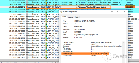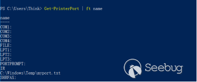 針對端口是文件的打印過程,spooler打印服務程序以impersonating方式來模擬當前用戶的特權進行文件寫入。因此,如果端口文件在受保護的系統目錄(例如C:\Windows\system32), 則非管理員下的PowerShell打印作業就會失敗。