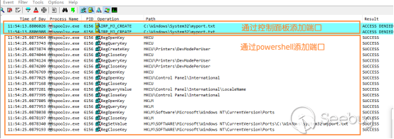 具體來講,針對PowerShell命令添加打印機端口,spooler程序直接設置了相應的打印機端口注冊表項;針對控制面板添加打印機端口,spooler程序會首先嘗試創建該端口文件,創建失敗后就不會再設置相應的注冊表項。