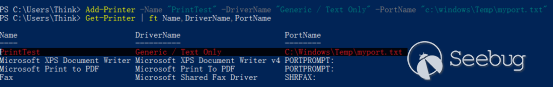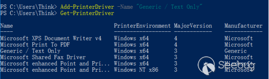 在添加一個打印機時,需要安裝打印機驅動。在MSDN文檔描述中,早期系統要求只有具備SeLoadDriverPrivilege權限的用戶才能安裝打印驅動,但為了便于標準用戶安裝驅動,從Windows Vista開始,只要打印機驅動是已經存在的可立即使用的驅動,就不需要任何特權即可安裝。例如,通過一條PowerShell命令即可安裝“Generic / Text-Only”驅動。