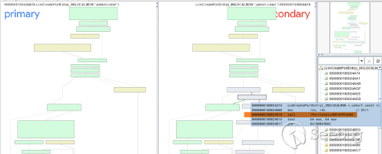 分析漏洞修復后的版本發現,微軟在關鍵函數LcmCreatePortEntry(最終創建打印機端口的函數)中添加了相應的端口合法性檢查代碼。下圖是關鍵函數LcmCreatePortEntry在修復前和修復后的Call Graph對比,可以看出:補丁的核心是通過函數PortIsValid對端口進行合法性檢查。