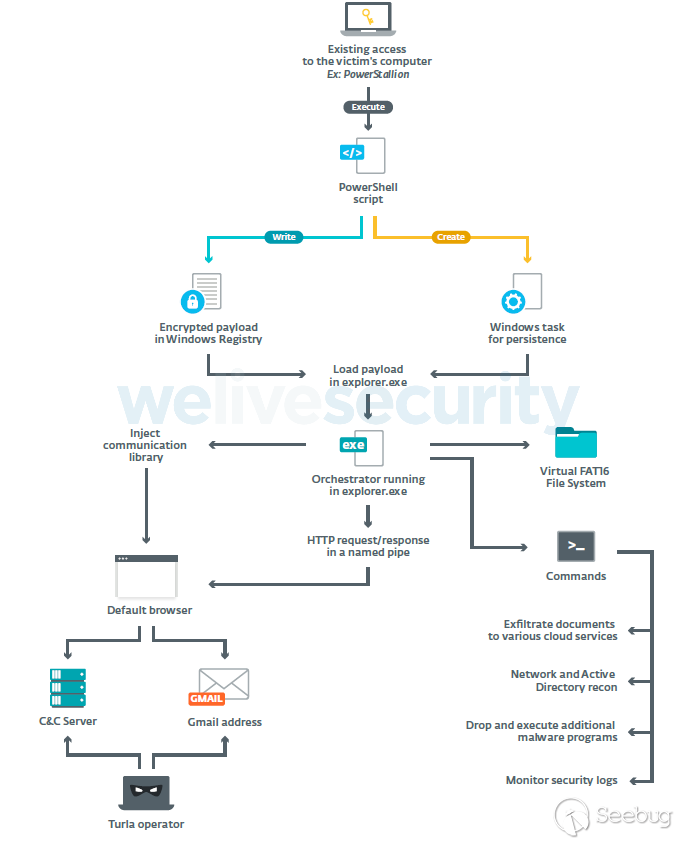 基于ESET遙測,我們認為ComRAT是通過現有立足點(例如,受感染的憑據)或另一個Turla后門進行安裝的。如:根據2019年描述的基于PowerShell的后門程序可以看到PowerStallion安裝了ComRAT 。