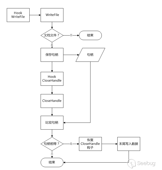 而dpnom.dll的主要作用為Hook WriteFile函數,監控到操作的文件為doc的時候,Hook CloseHandle函數,將%allusersprofile%\MediaCache中的一個文件附加寫到即將關閉的doc文件末尾,流程圖為: