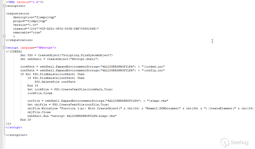 腳本會釋放locked.ini、config.ini、slmgr.vbs等文件,最終的惡意文件主要為%allusersprofile%\Identities\netwiz.exe和%windir%\System32\dpnom.dll。其中netwiz.exe主要用來收集機器的信息;dpnom.dll主要用來把收集到的信息寫到相應的地方保存。