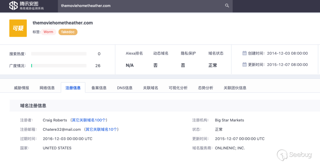 Asruex的C&C為themoviehometheather.com,該域名的注冊者為Chatere32@mail.com