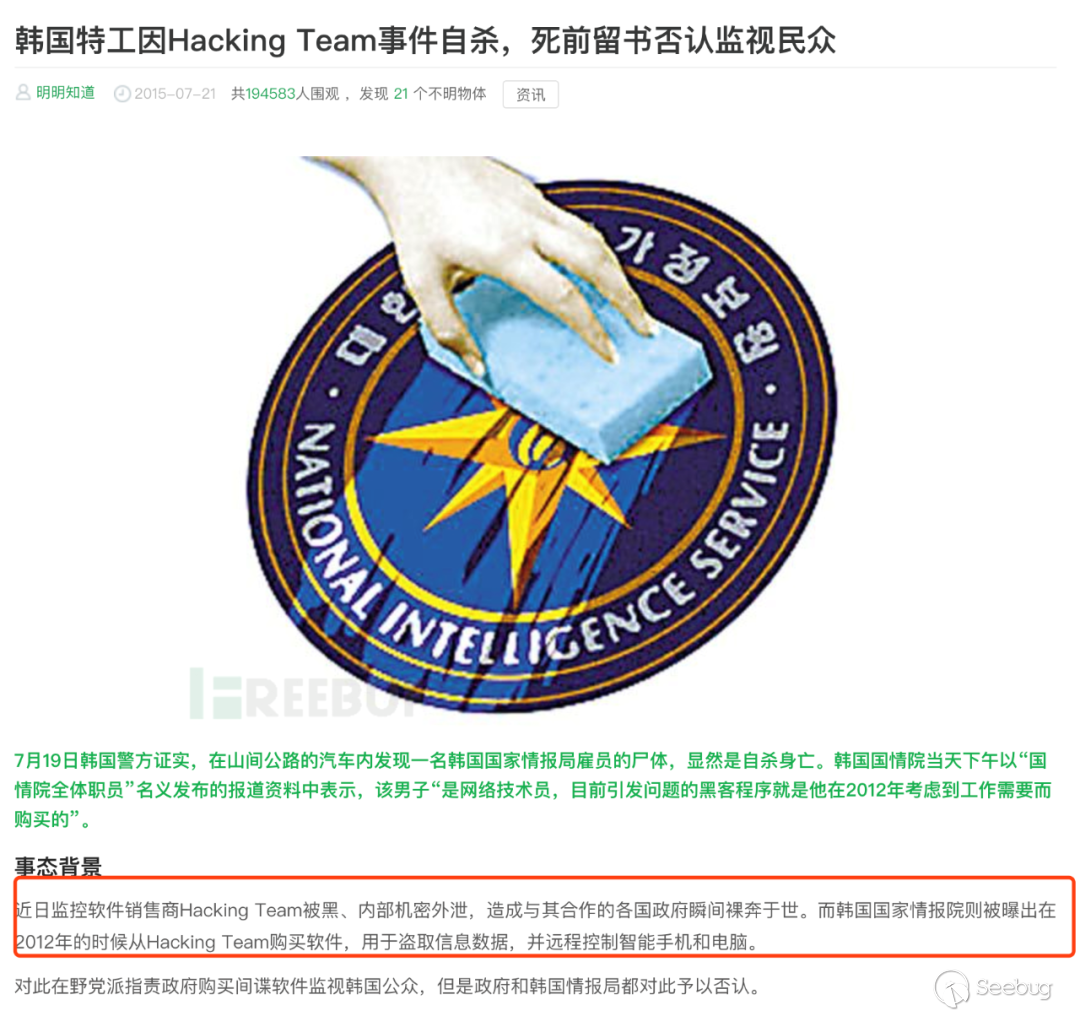 這也跟之前曝光的韓國情報官員因為購買HackingTeam間諜軟件而自殺的事件相印證: