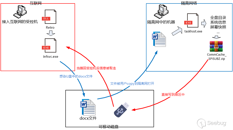 可移動磁盤進入隔離網絡。隔離網內的機器若執行被感染的文件,則收集該機器上的相關信息,并寫入可移動磁盤的磁盤扇區或文件的文檔文件的尾部;