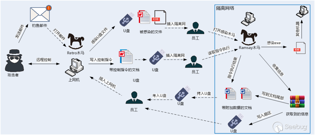 根據上面的分析,我們推測攻擊者針對物理隔離網絡的感染流程大致如下: