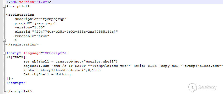 執行感染后的文件,同樣會觸發CVE-2017-8570漏洞,執行腳本OfficeTemporary.sct: