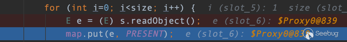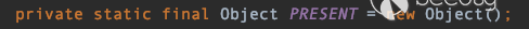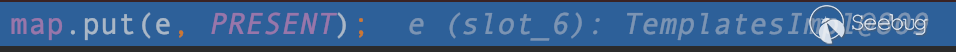 該方法最后可以看到有一個for循環,將LinkedHashSet對象在序列化時一個一個被序列化的元素在反序列化回來。該循環體中有一行代碼 map.put(e,PRESENT) 這里的map變量指向的是一個LinkedHashMap對象,PRESENT常量的值是一個空的Object對象由下圖可知