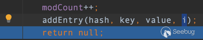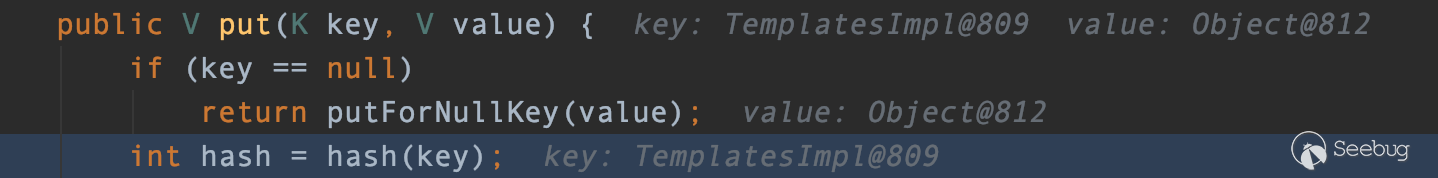 結果是0,完全符合我們的要求,這樣127乘以0自然結果是0,0在同TemplatesImpl對象的hash值進行異或,得到的結果自然也是TemplatesImpl對象的hash值本身。這樣就符合我們的要求。通過了LinkedHashMap.put方法中的for循環的判斷,由于hash值相同,所以計算出的索引相同,e的值就為之前的TemplatesImpl對象,所以e不為null 結果為true
