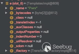 此時的變量e指向的是我們實現封裝進LinkedHashSet里的TemplatesImpl對象,里面存有我們的惡意代碼