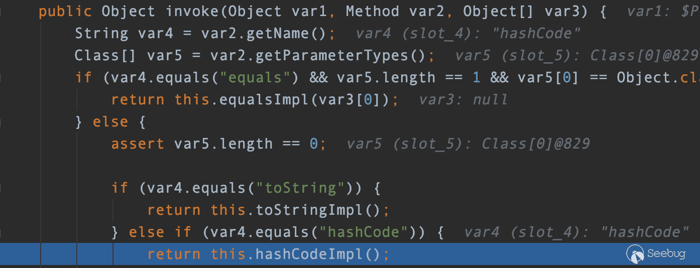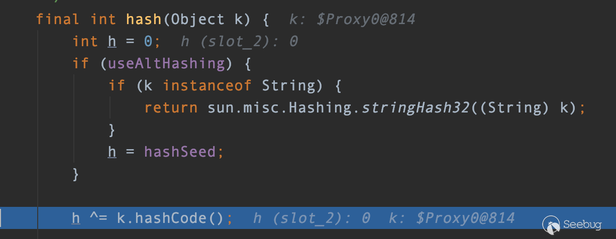 Proxy是一個動態代理對象,所以經過對調用方法名稱的判斷,最終調用AnnotationInvocationHandler.hashCodeImpl()方法