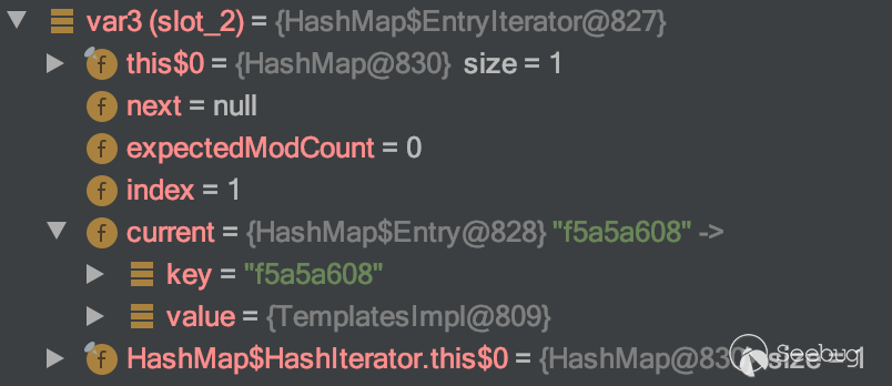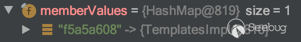 可以看到memberValues中只有一個鍵值對就是,就是我們在初期通過反射生成AnnotationInvocationHandler對象時傳入的HashMap對象中的那個鍵值對 key是一個字符串"f5a5a608" Value值適合第一次循環時用來計算hash值的同一個TemplatesImpl對象
