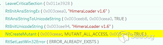 查看HimeraLoader.exe跟蹤,我們注意到在惡意代碼的初始加載過程中創建了一個非常有特色的互斥對象:Himera Loader v1.6互斥對象。