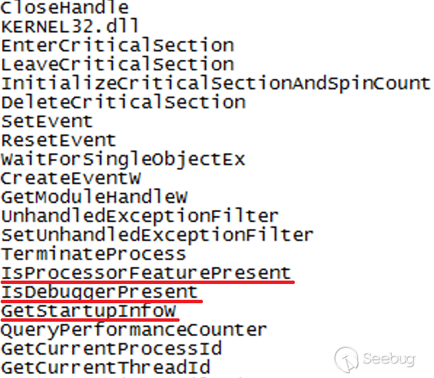 此外,該示例還使用Windows API執行了一些經典的反分析技巧,例如“IsDebbugerPresent”、“IsProcessorFeaturePresent”和“GetStartupInfoW”。如果存在調試器,則在程序流中采用不同的路徑。函數GetStartupInfoW以一個指向STARTUPINFO結構的指針作為參數,檢索在創建調用進程時指定STARTUPINFO結構的內容,該結構接收啟動信息并且沒有返回值。
