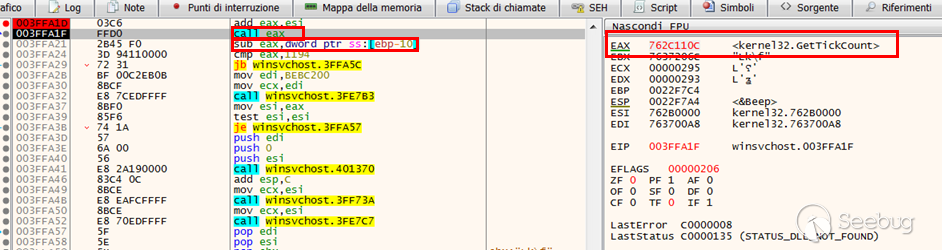 此外,該惡意軟件還采用了一些有趣的反調試技術,如GetTickcount(該技術與我們上一份報告中描述的技術非常相似)。將這兩個值相減后放在EAX寄存器中,在“調用eax”指令之后,立即減去第一個GetTickCount API調用,然后執行第二個文件。