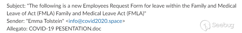 我們在日常的網絡監測中,對許多偽裝的電子郵件進行了攔截。這些郵件利用正在發生的冠狀病毒有關的FMLA(《家庭醫療休假法》)要求,使用Himera和Absent-Loader這兩種網絡犯罪工具對數據進行了處理。