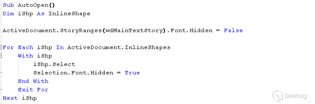 為了更好進行分析,我們將使用MD5的 hash: 7bebf686b6e1d3fa537e8a0c2e5a4bdc文件。宏的內容如圖所示: