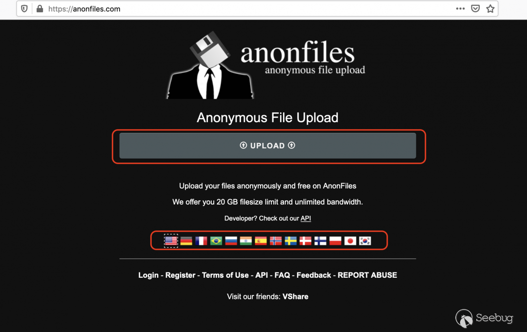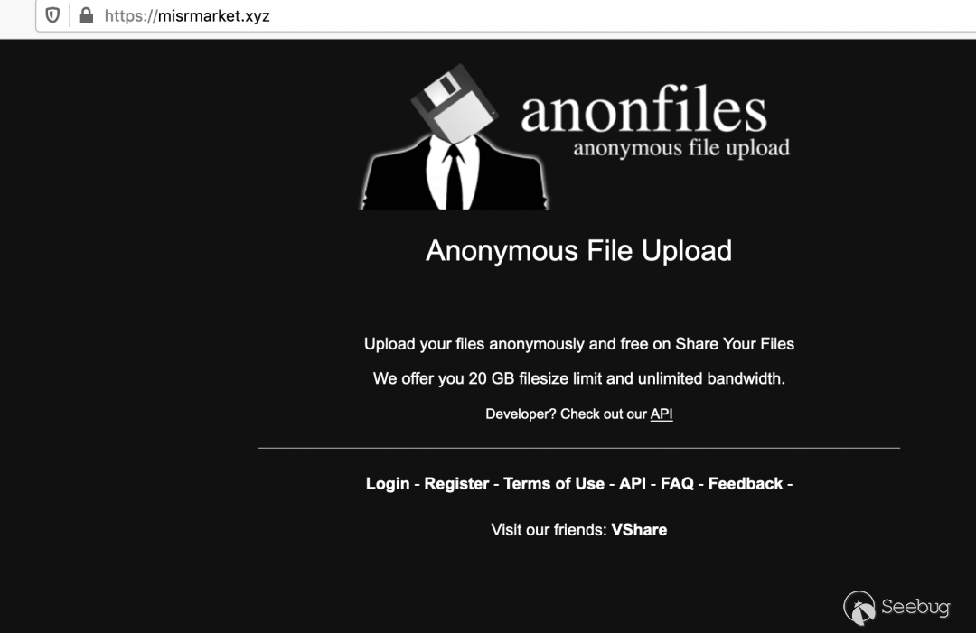 用于承載此文檔的網站是一個欺詐網站anonfiles.com,該網站允許用戶匿名上傳文件。但該欺詐網站站點和原始站點在用戶界面上存在著細微差別。下圖顯示了欺詐網站站點的用戶界面。