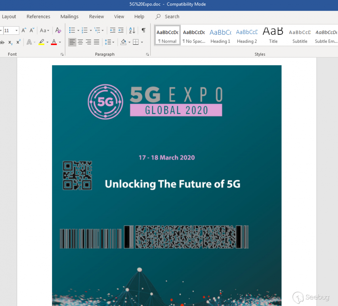 2020年2月,與此攻擊活動相關的示例文檔進行了發布,其托管網址為:hxxps://documentsharing.space/files/5G%20Expo.doc?clientEmail =