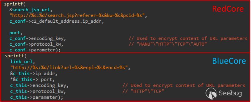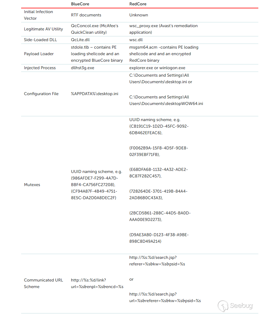 分析表明,潛在的惡意軟件因為使用方式不同形成了兩個活動集群。我們將變種命名為BlueCore和RedCore,對每個變種周圍發現的相關信息進行了檢查,下表總結了相關的植入變體特征: