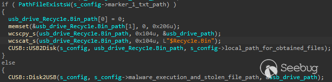 連接USB后,惡意軟件將驗證偷來的數據進行復制或驗證。在驅動器中搜索名為“$Recyc1e.Bin”的目錄,如果找不到該目錄,則會創建該目錄。此目錄將作為文件復制到驅動器的目標路徑或從中獲取文件的源路徑。