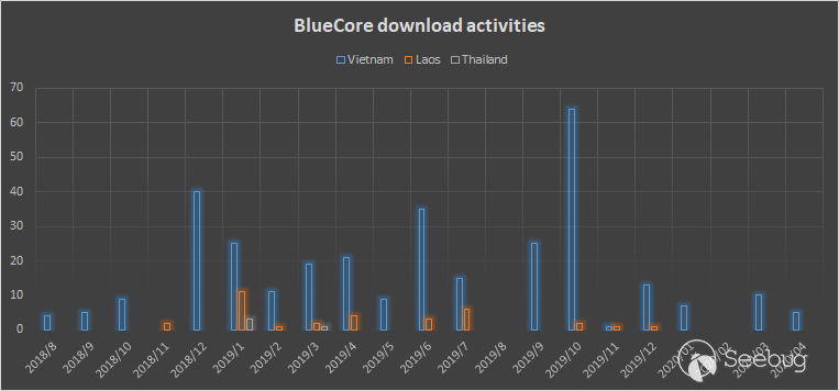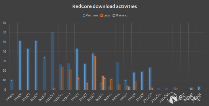 由此我們得出的結論是,盡管所有目標都是外交和政府實體,但每組活動都有不同的地理重點。BlueCore集群背后的運營商將大部分精力投入到了越南目標上,并在老撾和泰國建立了多個離群值,而RedCore集群的運營商最初則側重于越南,2018年底轉移到了老撾。相關數據如圖: