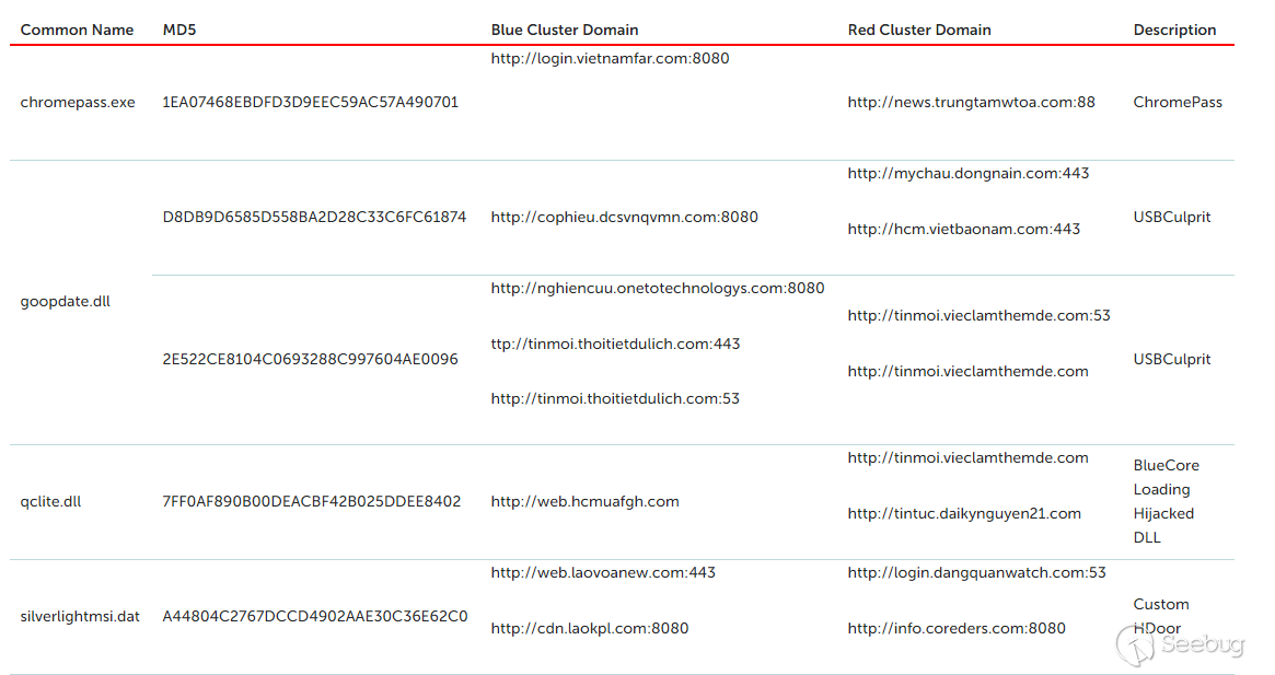 通過對比我們發現看到的活動屬于單個參與者,我們稱之為Cycldek。在一些情況下,我們發現了從兩個組的服務器下載的由組編寫的獨特工具。如下圖所示,其中一個例子是USBCulprit組織自定義構建的工具,它的兩個樣本是從BlueCore和RedCore服務器下載的,附錄中提供了更全面的列表。總而言之,這意味著這些集群后面運行的實體正在共享多個資源(包括代碼和基礎結構),并且在單個組織的保護下運行。