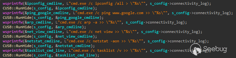 惡意軟件的特征可以讓我們對它的目的做出一些假設,其中一個假設是要從具有空隙的計算機中獲取數據。這就解釋了惡意軟件中沒有任何網絡通信,只使用移動媒體作為傳輸入站和出站數據的手段。此外,我們還看到一些變體發出命令來收集主機網絡信息的不同部分,這些數據被記錄到一個文件中,然后與被竊取的數據一起傳輸到USB上,這可以幫助攻擊者分析被執行惡意軟件的計算機是否屬于隔離網絡的一部分。