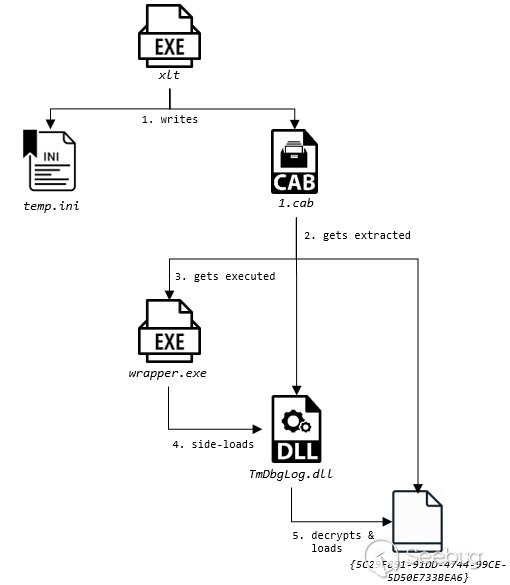 這個加載方案表明,它背后的操作者利用了先前描述的歸因于Cycldek的植入軟件中所見的類似TTP。如,模仿AV組件的二進制文件被用于執行DLL負載順序劫持。在這樣的情況下,從cabinet歸檔文件中刪除的一個名為wrapper.exe的文件(最初名為PtUserSessionWrapper.exe,)強制執行一個名為TmDbgLog.dll的惡意DLL。此外,該惡意軟件利用加密blob,使用RC4解密并用自定義PE加載器執行。完整的鏈如下圖所示: