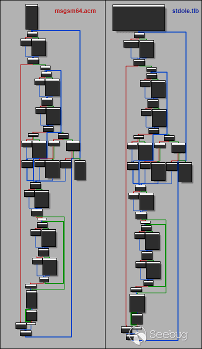 此外,兩種植入變體都利用了類似加載RedCore和BlueCore植入軟件的shell代碼。shell代碼在文件的‘stdoletlb’和‘msgsm64.acm’中,其包含用于從嵌入式blob解密植入軟件的的原始可執行文件,然后將其映射到內存,并在入口點執行例程。由于這兩種變體的兩段shell代碼是相同的,且屬于不同的開源項目,因此我們認為它們來自一個專有的共享資源。