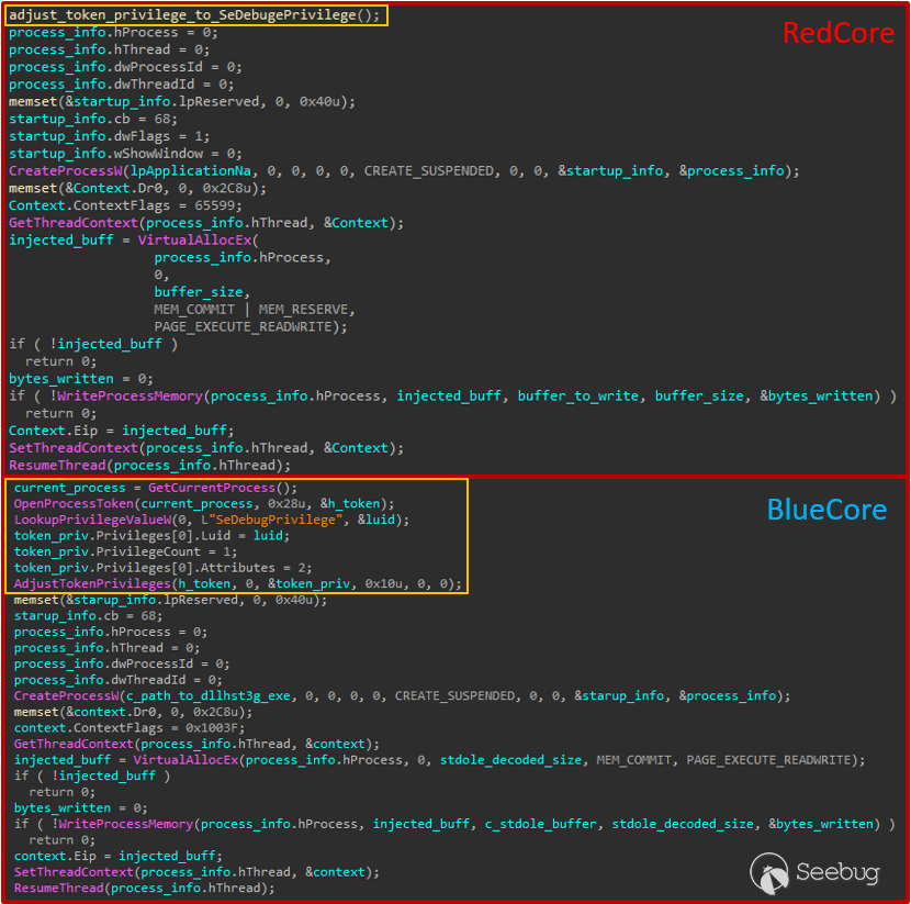 如表所示,這些變體具有相似行為。兩者都使用DLL加載順序劫持來運行DLL中的代碼,模擬合法的AV應用程序的依賴關系,并且都共享隨機UUID的互斥體命名。通過比較兩大植入的變體,我們可以發現源自PCShare RAT的多種功能,但是其他一些代碼(如下圖中的注入代碼)是專有的。