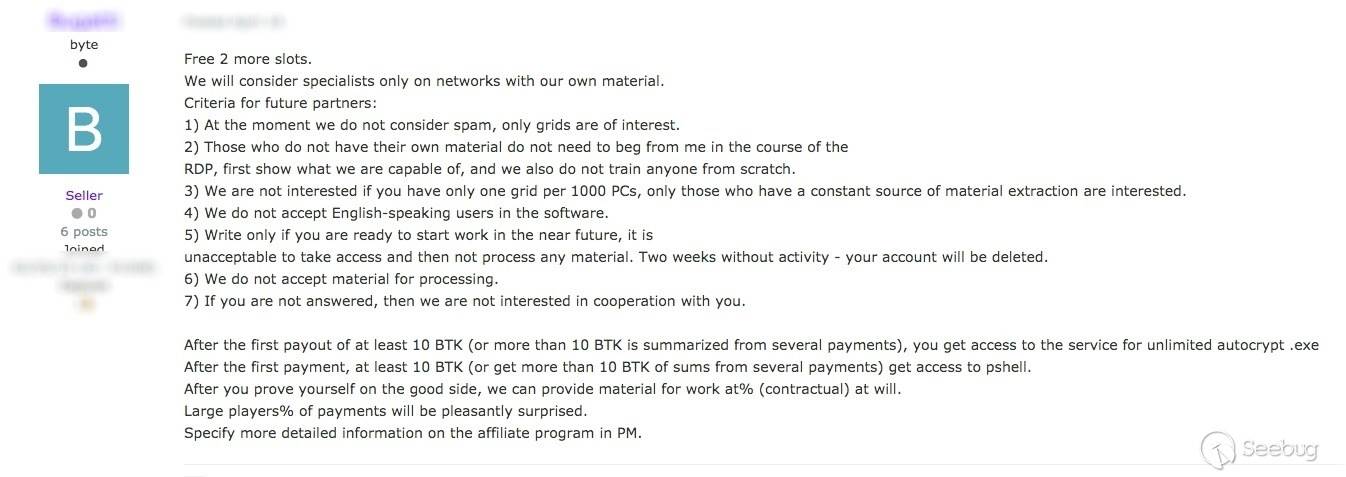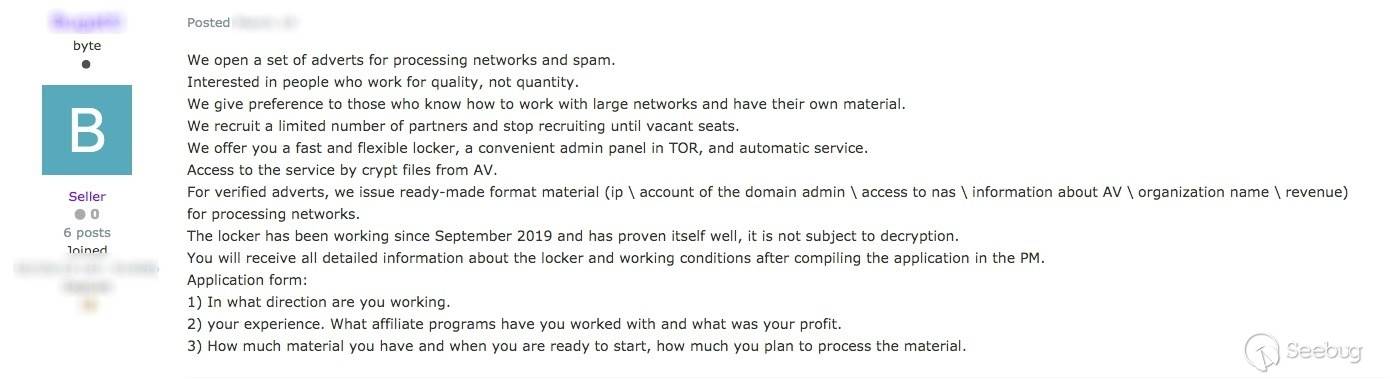 對于回應NetWalker潛在犯罪分子,“affiliate partner’”詳細介紹了篩選過程,這是成為 NetWalker 附屬機構的先決條件。 最初,聯盟將要求潛在客戶提供以下信息: