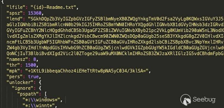 NetWalker配置文件還包含贖金記錄的base64編碼副本。其中有目標公司名稱和其他相關數據,編碼的字符串在配置文件的“ lend”值中進行分配。