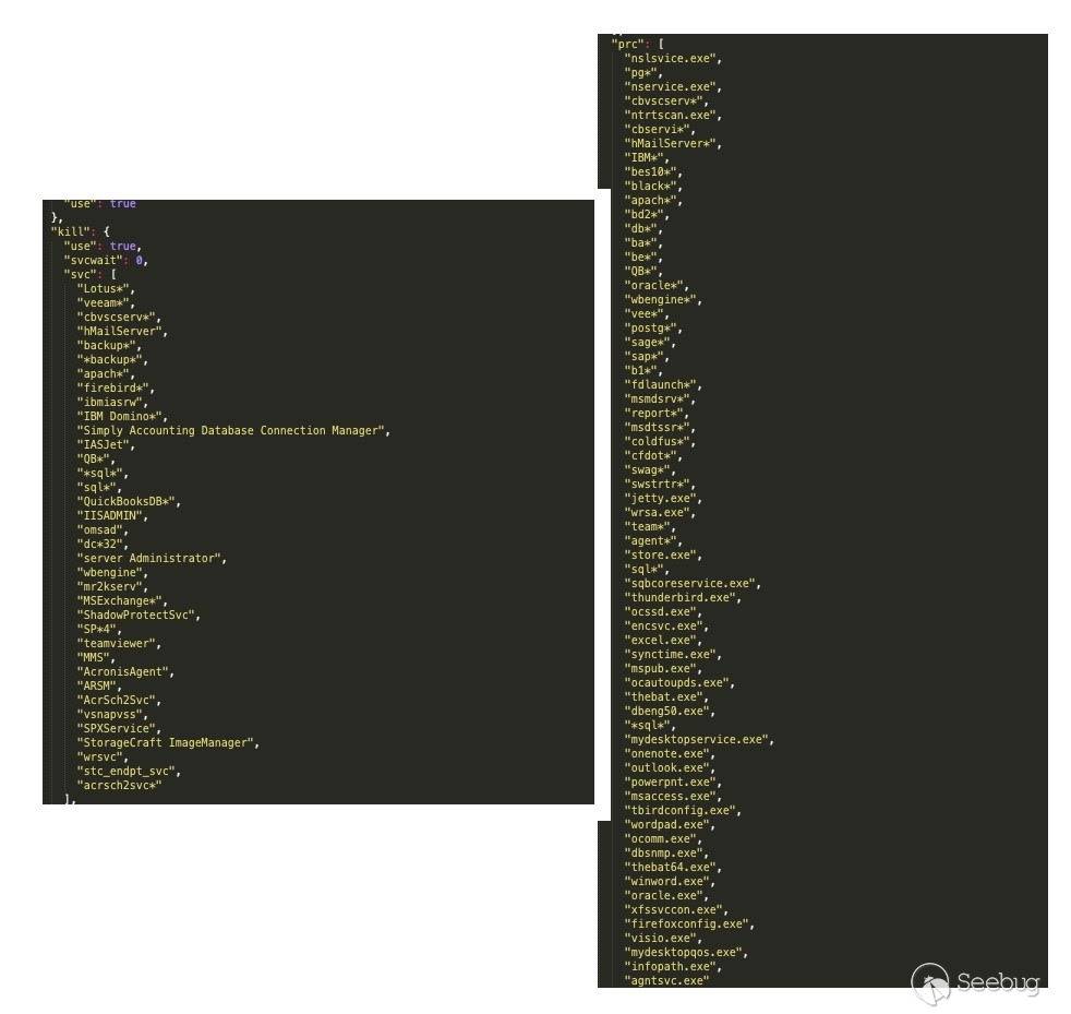 Netwalker注意確保任何用于加密或外泄的數據/文件的可用性。每個配置文件都包含要發現和終止的進程列表,不對數據收集或文件加密進行干擾。配置文件列出了在惡意軟件的主要任務終止前的服務和進程。