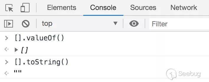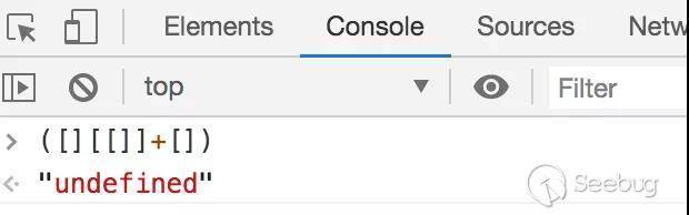 第一段JS([][[]]+[])根據優先級會先執行[],[]會定義一個空數組,[[]]會定義一個二維數組,那么[][[]]就是在一個空數組里面去尋找下標是一個非數字的值,肯定會返回undefined。到這可以分解成undefined+[],因為兩把的操作數類型不一致,這里會調用ToPrimitive來進行轉換