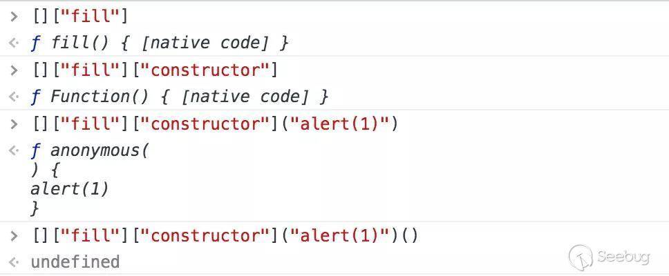 經過一步步拆解,最后執行的JS代碼是[]["fill"]["constructor"]("alert(1)")(),那這段代碼為啥會執行alert(1)呢,通過控制臺分解看下。