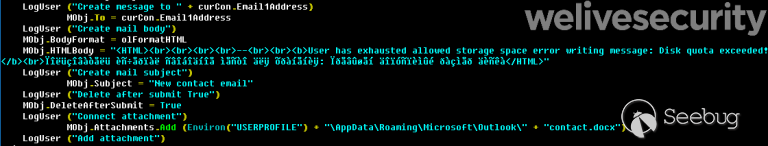 這個惡意代碼包從一個VBScript開始,如果Outlook進程正在運行,它會首先終止該進程,然后通過更改注冊表值來移除Outlook中VBA宏,保證運行環境的安全性。它還會將包含宏、惡意電子郵件附件以及在某些情況下將電子郵件發送到收件人列表的惡意OTM文件(Outlook VBA項目)保存到磁盤。