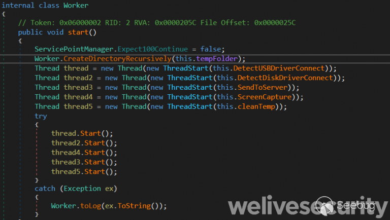 這是C/C++版本的C#中重新實現。主要區別在于它還從受感染計算機中獲取屏幕快照。如圖所示,我們分析的版本具有五個名稱的線程。